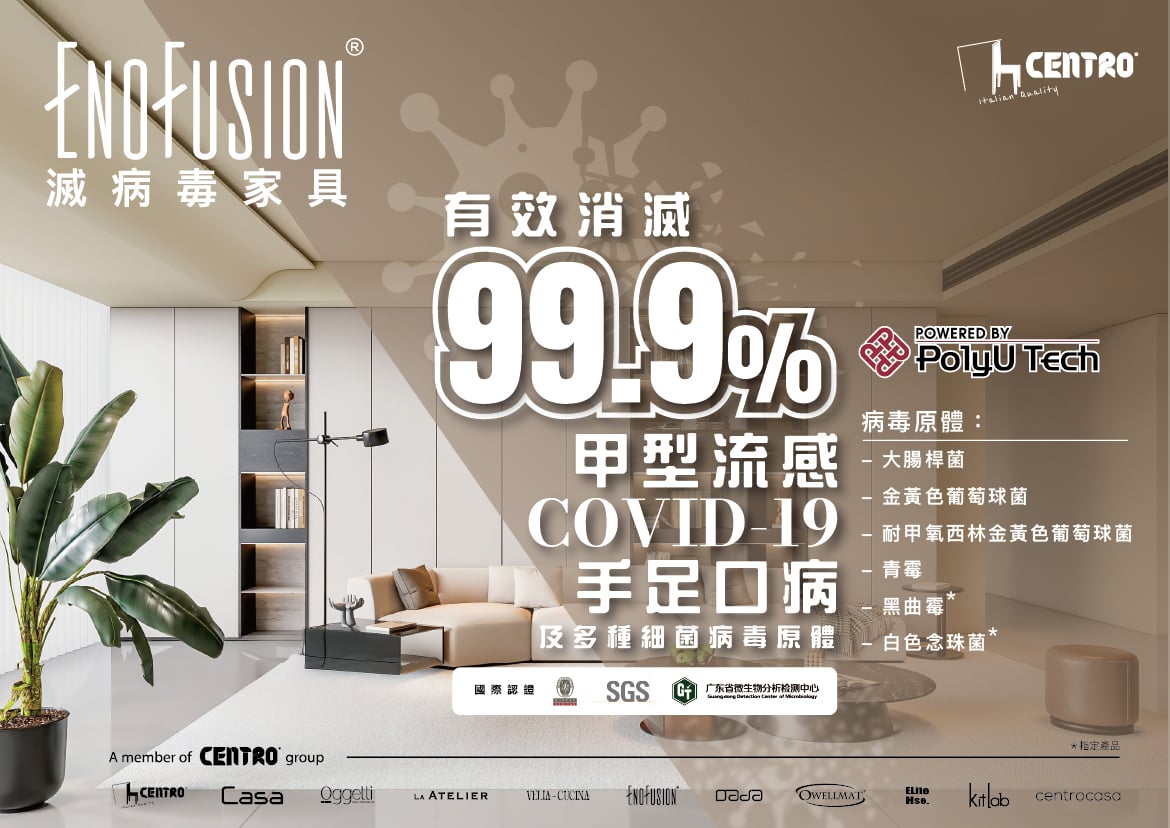 這項嶄新技術早已通過國際權威檢測機構的嚴格測試,報告明確顯示:此滅病毒技術有效消滅高達99.9%的甲型流感病毒、人類冠狀病毒 (COVID-19)、柯薩奇病毒 (手足口病)、大腸桿菌、金黃色葡萄球菌、耐甲氧西林金黃色葡萄球菌 (MRSA) 等多種病原體,並能長期維持效能。現時CENTRO® 已應用此技術推出EnoFusion® 滅病毒家具,涵蓋板材與皮革等多種材質,餐檯、書檯、櫥櫃、鞋櫃等全屋家具均可根據您的需求定製,無論是現代簡約、極致奢華等風格都能完美契合。不用為了防疫犧牲家居美感,也不用為了尺寸不合而妥協,定制過程全程省心,讓防護與舒適共存。